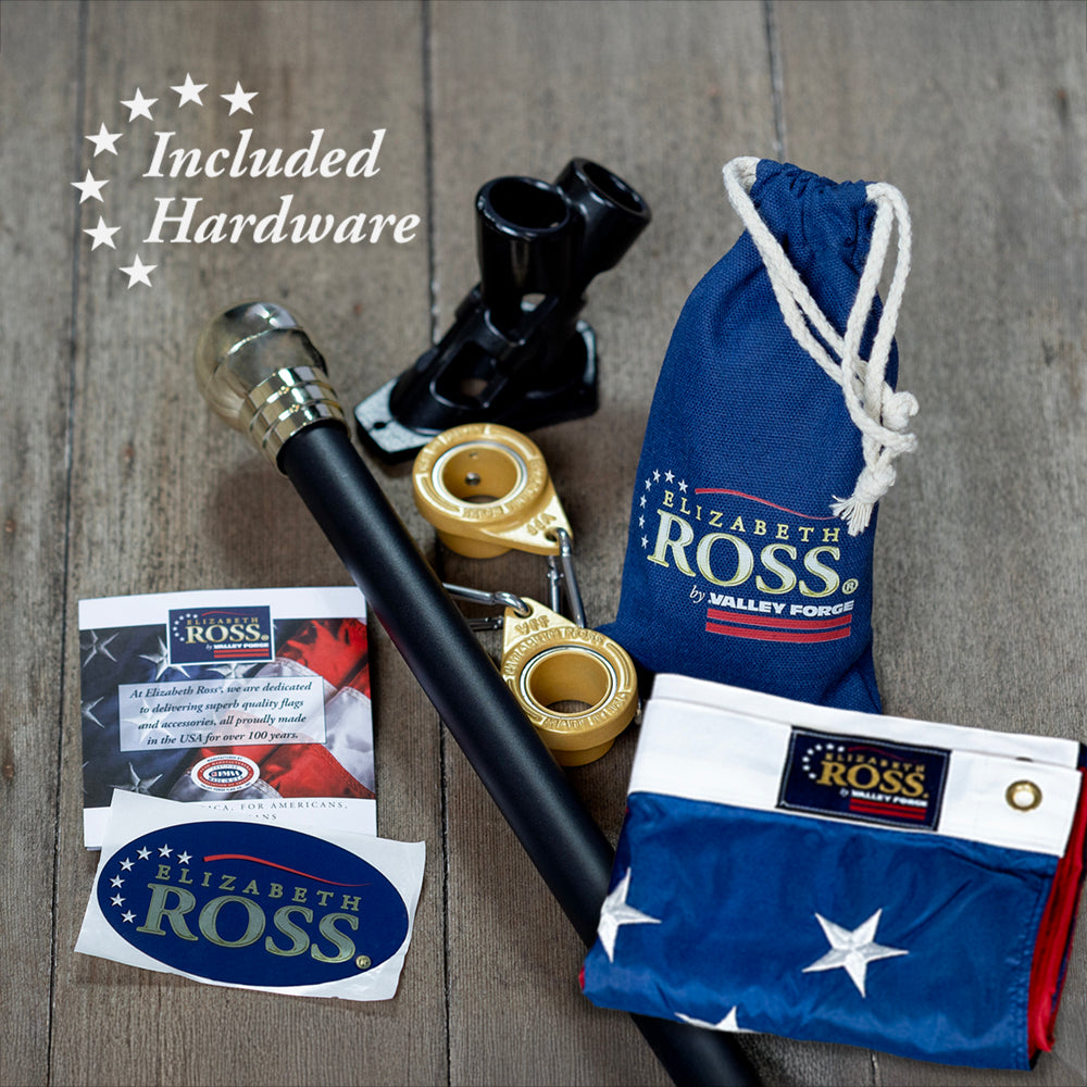 3' x 5' Elizabeth Ross American Flag Kit with Black Aluminum Pole, Gold Finial, Spinning Rings, and Mounting Bracket