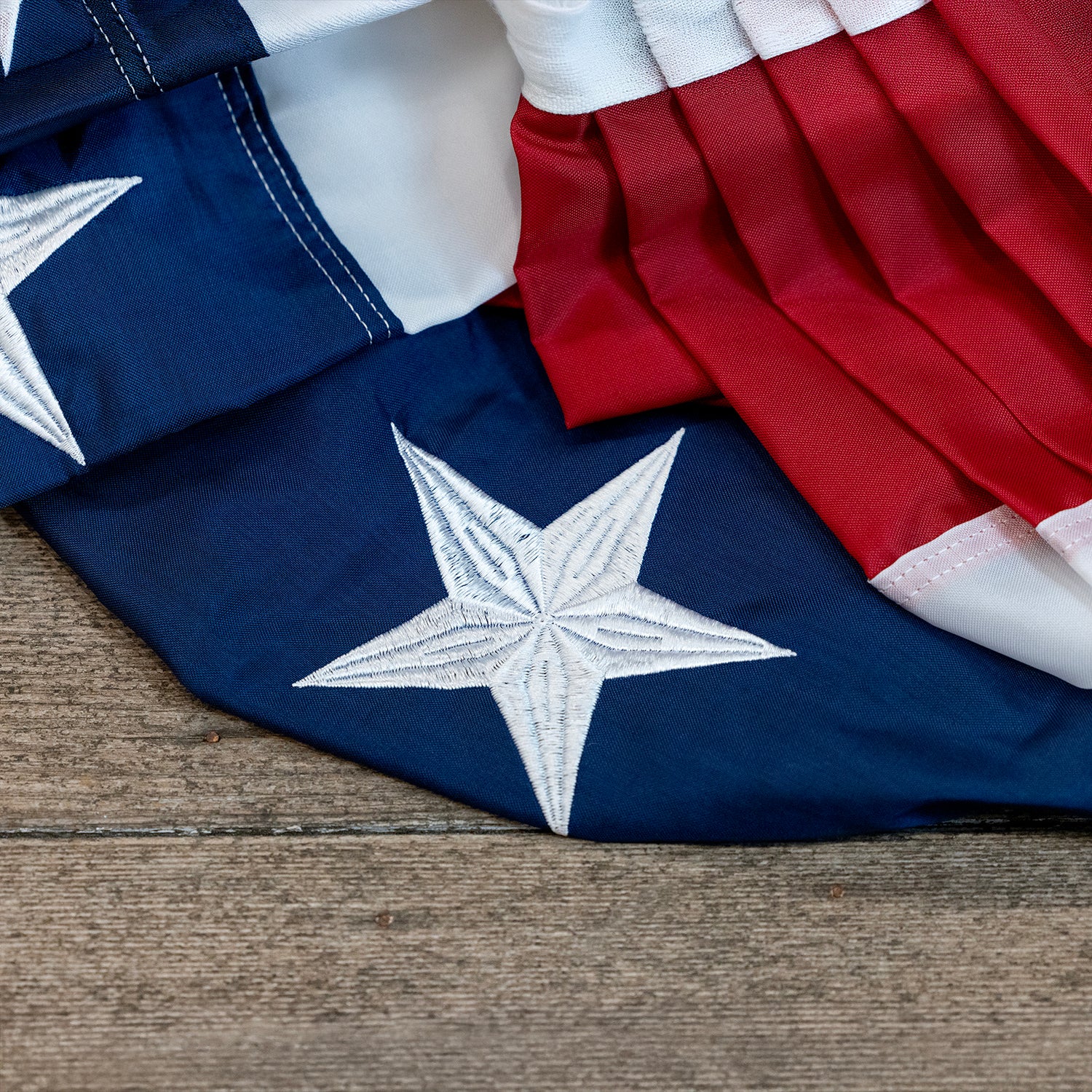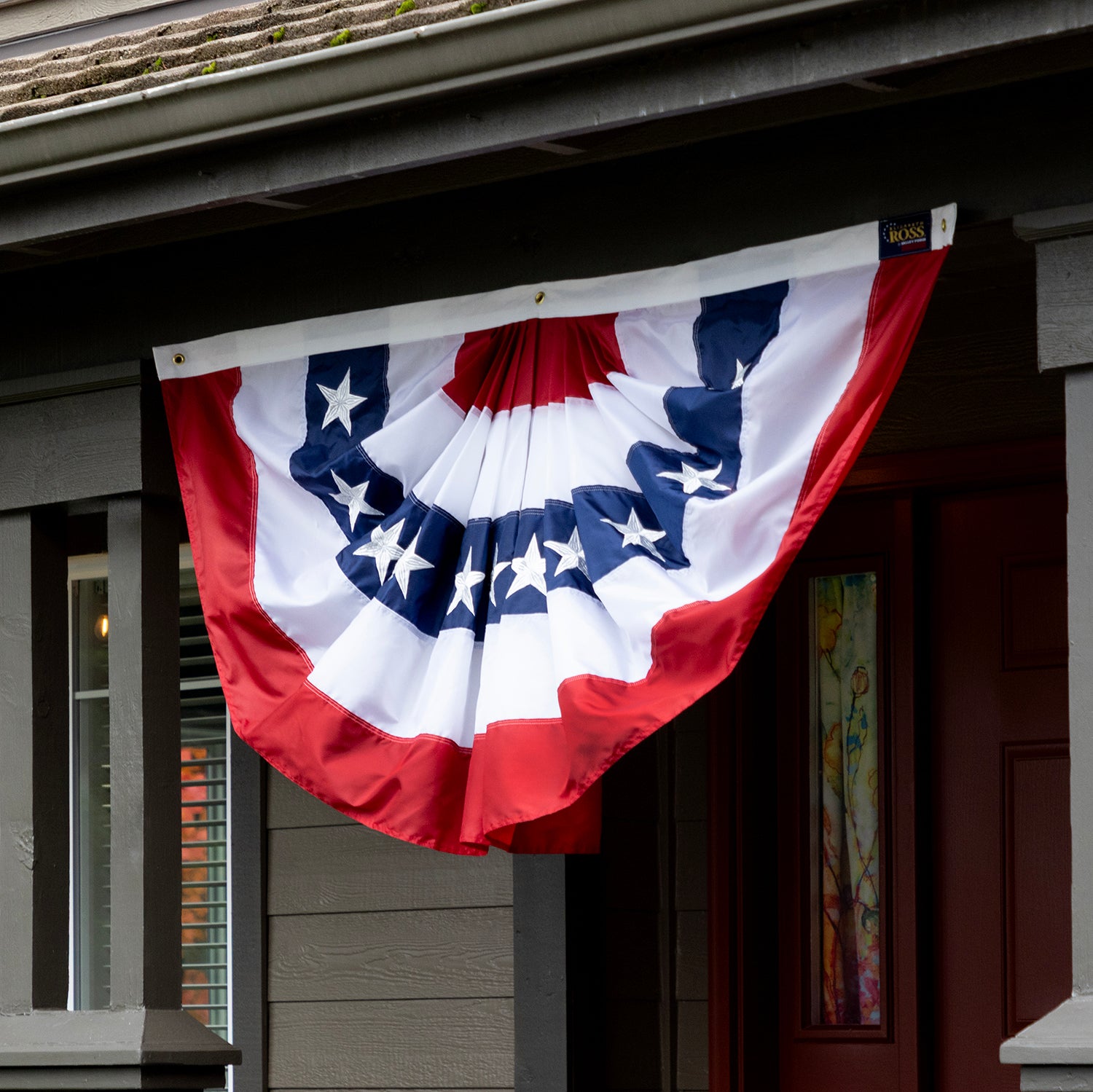 Elevate your home with the Elizabeth Ross 3' x 6' Patriotic Bunting, crafted with the same care, heritage, and premium materials found in every Elizabeth Ross flag. Each red, white, and blue panel is individually sewn from durable nylon, double stitched for strength, and pleated into a full, elegant drape. The bunting features large 4.5 inch embroidered stars stitched with extra bright polyester filament, creating a raised, faceted appearance that catches the light beautifully. Reinforced lockstitching along the fly end adds durability in outdoor conditions. Finished with our signature 2.5 inch header and three brass grommets, this bunting delivers a bold patriotic statement for porches, railings, and storefronts. Proudly Made in the USA, it reflects the craftsmanship and tradition that define Elizabeth Ross by Valley Forge Flag.